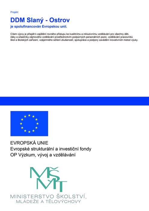 Od 1. 10. 2022 do 30. 9. 2025 je Dům dětí a mládeže „OSTROV“ Slaný zapojen do projektu Ministerstva školství mládeže a tělovýchovy Operačního programu Jan Amos Komenský ( OPJAK), který je spolufinancován z Operačního programu Výzkum, vývoj a vzdělávání Evropských strukturálních a investičních fondů EU.